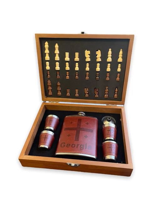 Chess set with Georgia flask and glasses